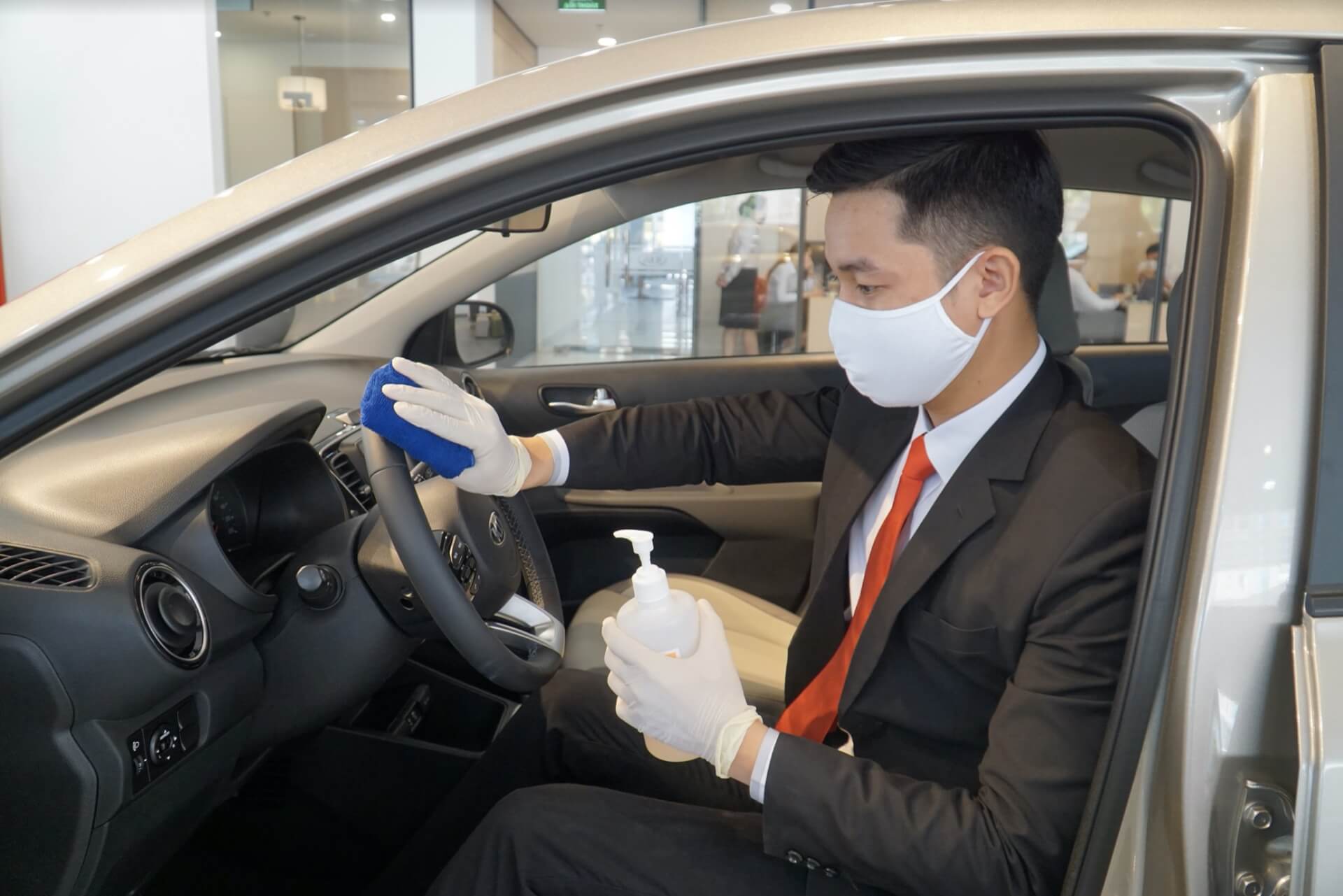 Tư vấn viên Kia Việt Nam vệ sinh xe bằng dung dịch khử khuẩn.